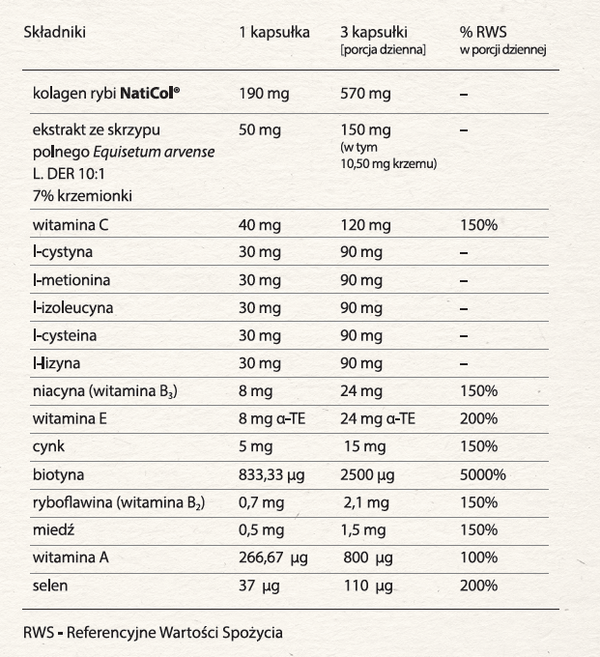 kolagen rybi NatiCol, otoczka kapsułki (żelatya), ekstrakt ze skrzypu polnego Equisetum arvense L. DER 10: standaryzowany na 7% krzemionki,l-cystyna, l-metionina, l-izoleucyna, l-cysteina, l-lizyna, kwas l-askorbinowy, mleczan cynku (cynk), octan dl-tokoferylu (witamina E), l-selenometionina (selen), amid kwasu nikotynowego (niacyna), substancje przeciwzbrylające: sole magnezowe kwasów tłuszczowych oraz dwutlenek krzemu, siarczan miedzi (miedź), octan retinylu (witamina A), d-biotyna (biotyna), ryboflawina (witamina B2)
